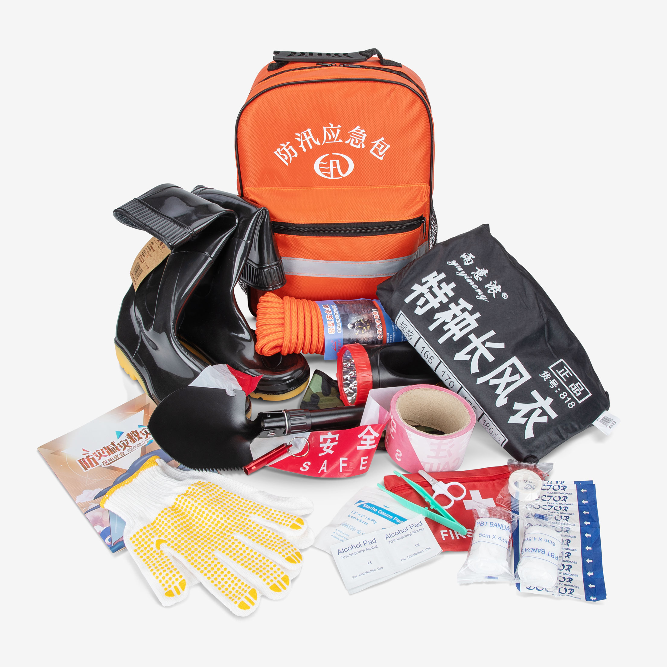 WYTHE 伟兹防洪防汛应急包内配应急救生衣大容量防水应急套装;主要配件防水背包、手机防水袋、充气救生衣、水上救生绳、手摇手电筒、手摇手电筒、劳保手套、常规创可贴、医用胶带、纱布片 、碘酒片、自粘绷带、蓝标三角绷带、酒精片、橘黄色剪刀、猪鼻子面罩、压缩毛巾、金属口哨 、棉签 、TPE止血带、双银急救毯、急救包