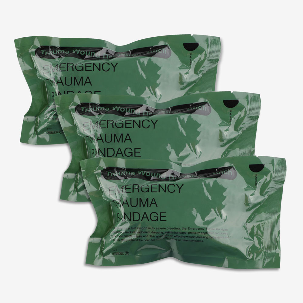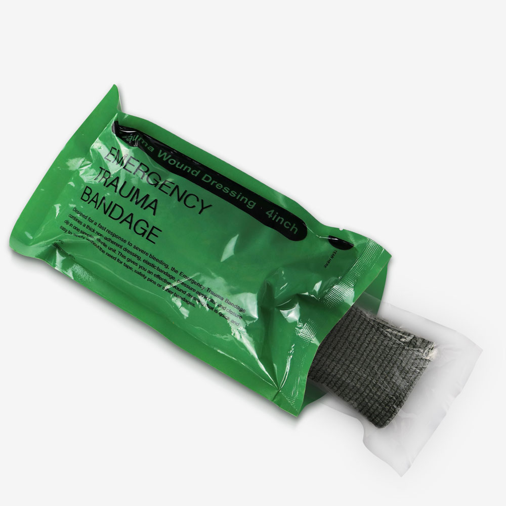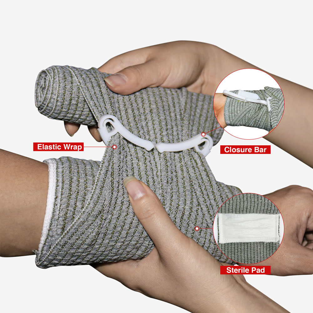 带用于身体各部位的止血包扎。现役美军部队广泛采用的绷带称为以色列绷带,其因以色列国防军设计而得名。相比于传统绷带,这种以色列绷带的特点在于:(1)其为弹性绷带,而不是非弹性绷带,这样,对创伤的压迫止血作用更加明显;(2)绷带内侧附有无菌敷料带,外侧设有用于固定的月牙形塑料卡扣,操作简便,同时也实现了可单手固定包扎。使用者只要撕开无菌包装取出并展开绷带卷,将白色的无菌敷料带对准创伤部位覆盖好,将绷带穿过固定卡扣固定即可。